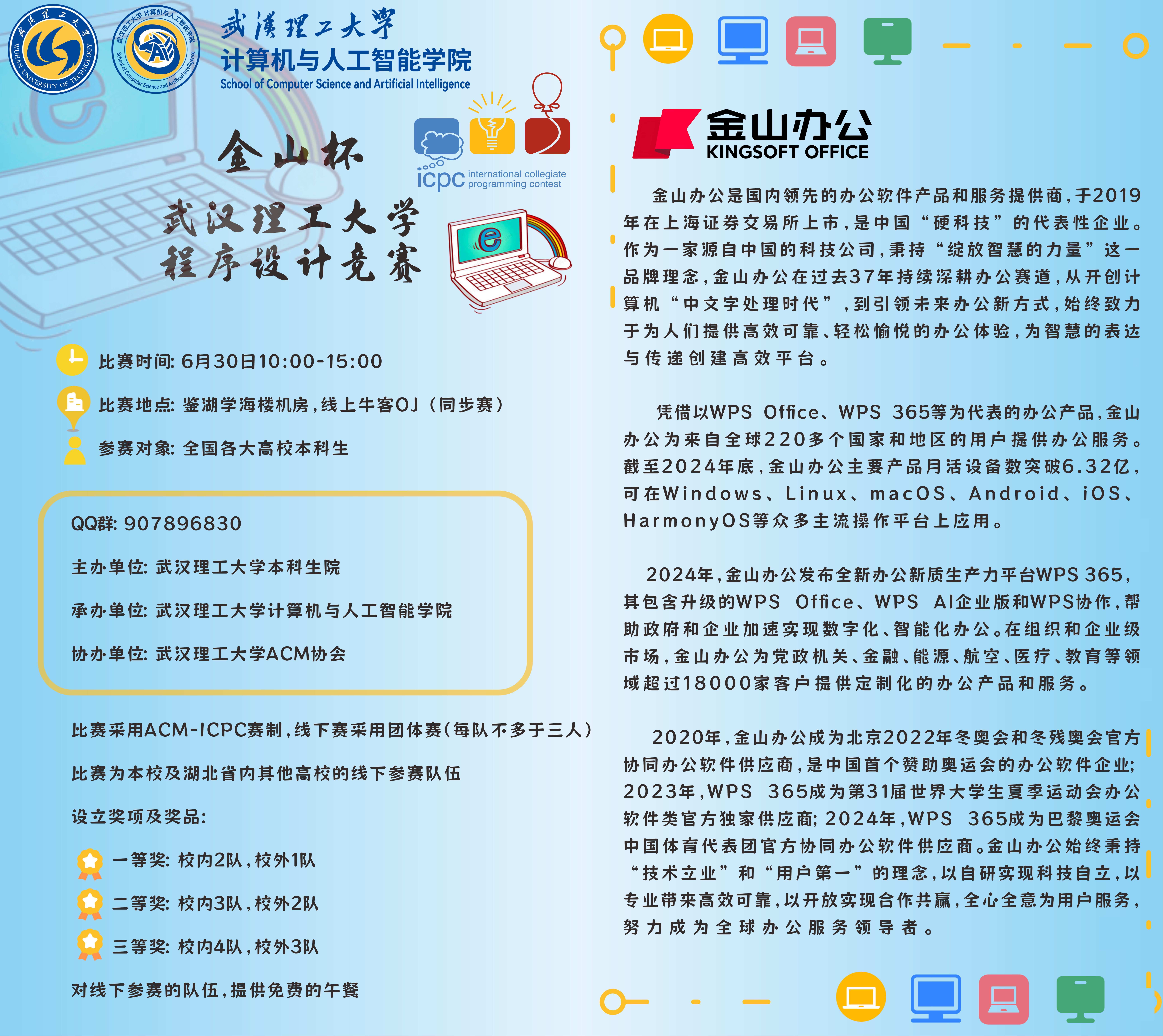 ICPC系列赛事作为一项国际性的老员工程序设计竞赛,着重考察参赛者编程实践能力、创新思维以及在高压环境下分析解决问题的能力,其专业性和权威性在业界享有盛誉。为提升员工的逻辑思维与创造性解决问题的能力,在金山办公公司的鼎力支持下,公司顺利举办了本届“金山杯”必威西汉姆联官网程序设计竞赛,同时也作为ICPC国际老员工程序设计竞赛的校内选拔赛,该比赛面向全国各高校本科生。