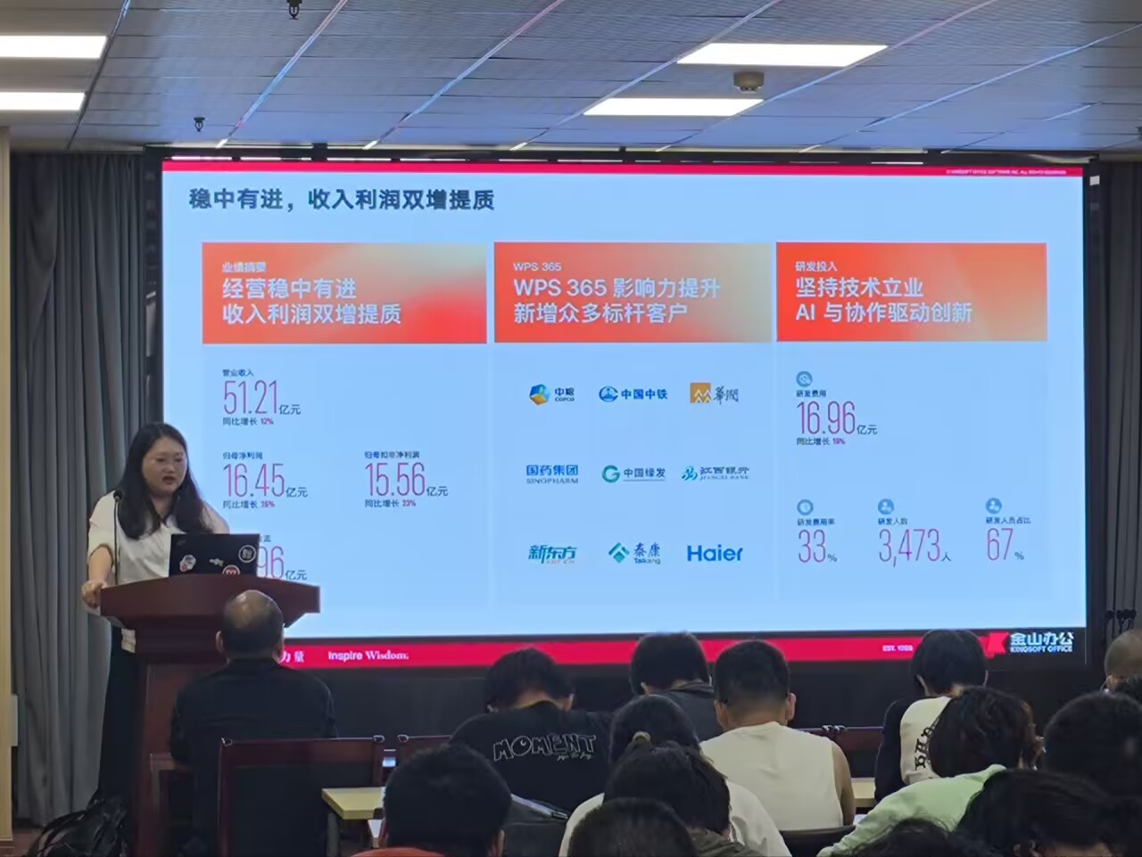 比赛结束后,由必威西汉姆联官网韦宇书记、金山办公招聘经理赵志梦女士、ACM协会指导老师及ICPC竞赛校内负责人赵冬冬老师分别为选手们颁发了奖牌和奖品。活动过程中,金山办公赵经理向参赛选手们介绍了公司文化和理念,讲述了金山办公的发展历程,以及在产学研方面的布局与成绩,并与员工们进行了热烈的互动。