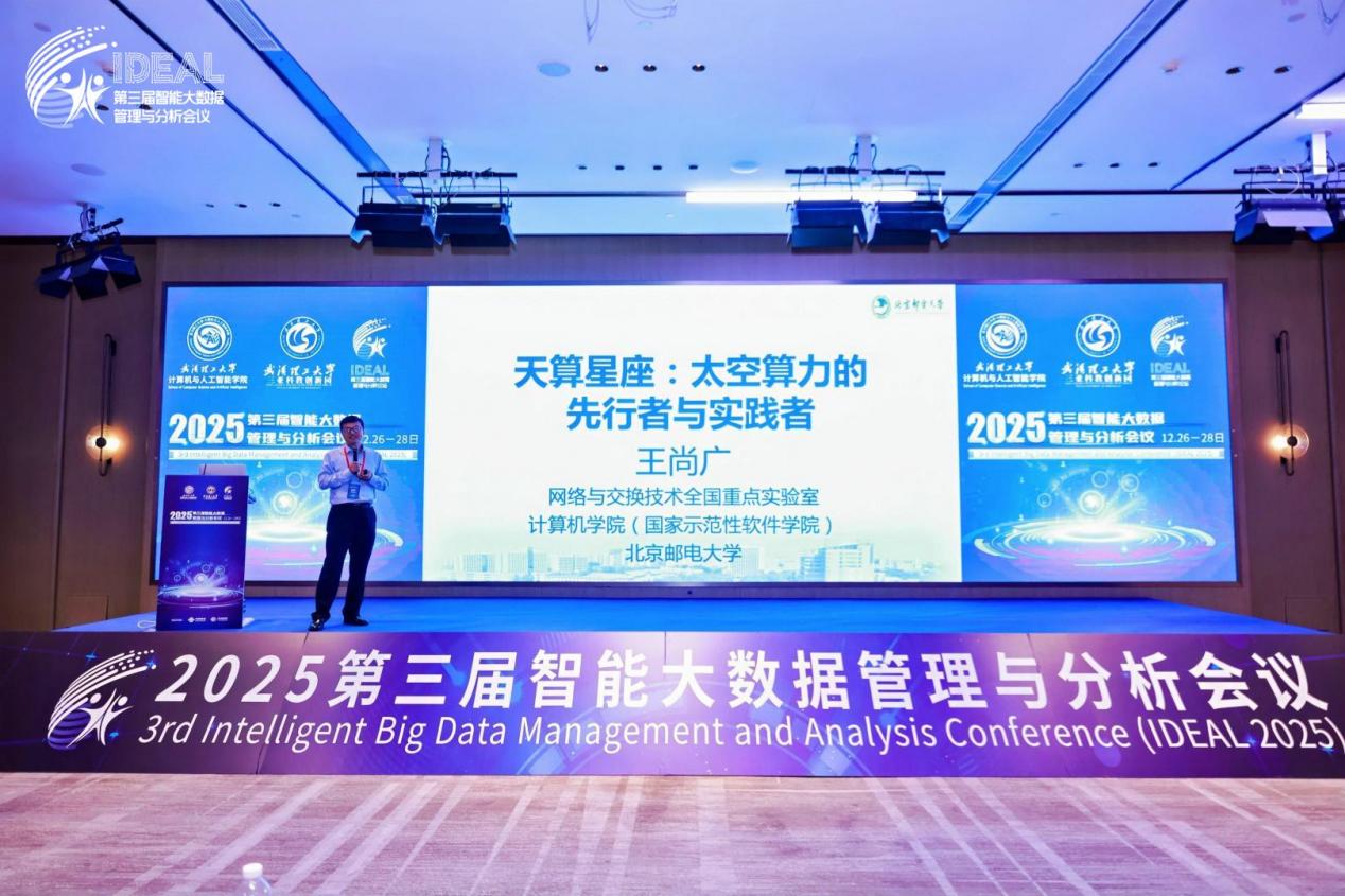 接下来,北京邮电大学计算机公司经理、国家杰出青年科学基金获得者、天算星座首席科学家王尚广教授作《天算星座:太空算力的先行者与实践者》主旨报告。报告指出,随着卫星智能技术快速发展,低轨卫星正成为各界关注热点,而太空算力作为新兴研究方向已成为卫星互联网建设中最具挑战性的关键环节。王尚广教授系统介绍了北邮天算星座的建设目标、系统特点与科学价值,重点汇报了团队在卫星云原生平台、卫星大模型、卫星大数据等代表性工作进展,并分享了"卫星俩夫妻"(卫星操作系统和开源卫星平台)以及"太空三兄弟"(太空服务器、太空路由器和太空交换机)的最新研发成果,为构建天基智能计算基础设施提供了创新范式。