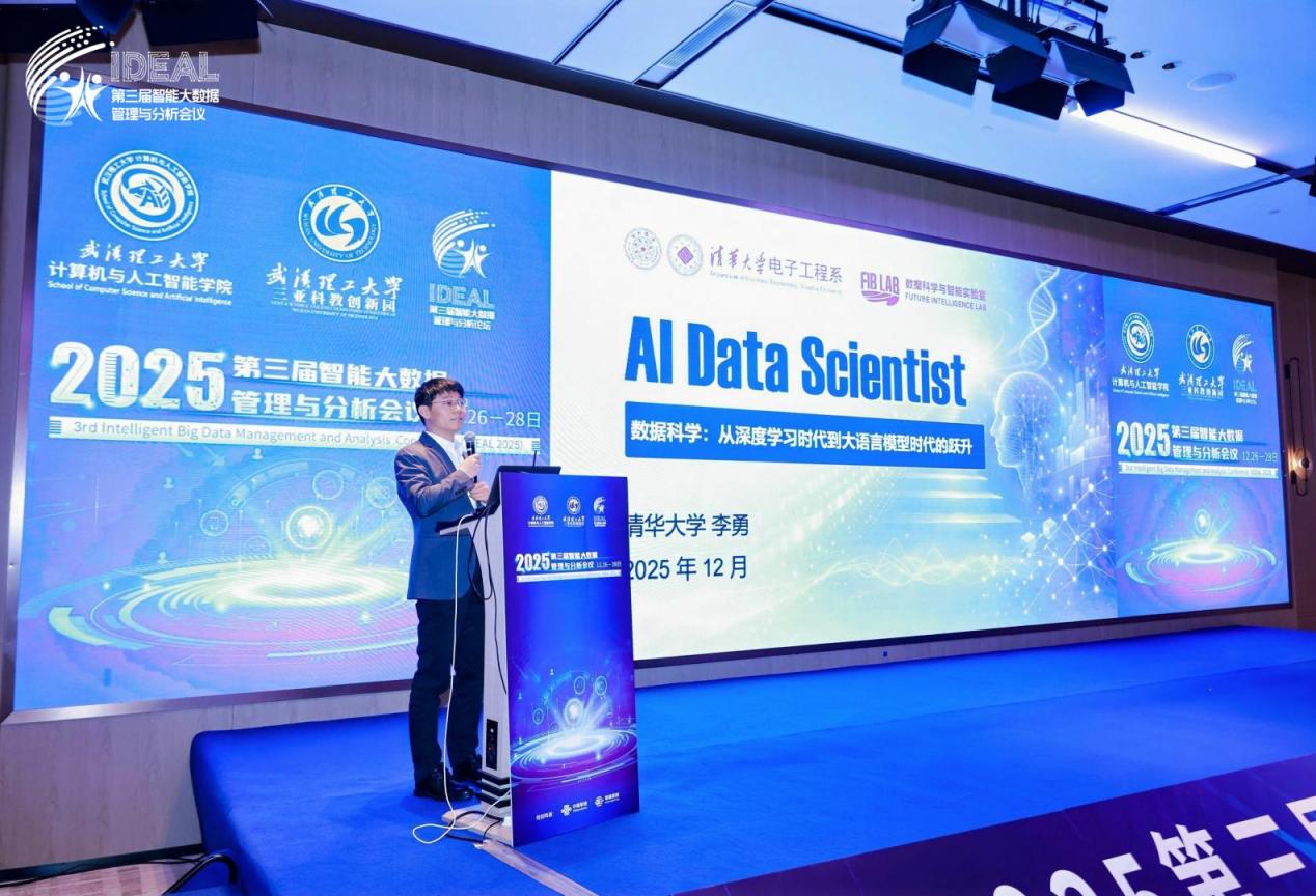 随后,清华大学电子系长聘教授、教育部长江学者李勇作《AI Data Scientist(AI数据科学家)》主旨报告。报告指出,从深度学习时代到AI Scientist时代,数据科学研究正经历根本性范式跃迁:从依赖人工设计算法、以数据为中心的性能优化,转变为以科学问题为导向、具备自主发现能力的智能生态系统。李勇教授强调,AI Data Scientist通过编码人类科研基础设施——结构化知识网络、协作协议与评审机制,实现了从文献调研、假设生成、实验验证到论文撰写的端到端自主科研流程,推动AI从工具执行者升格为科学共同体的参与者,标志着科学研究进入人机共融、持续演进的新时代。