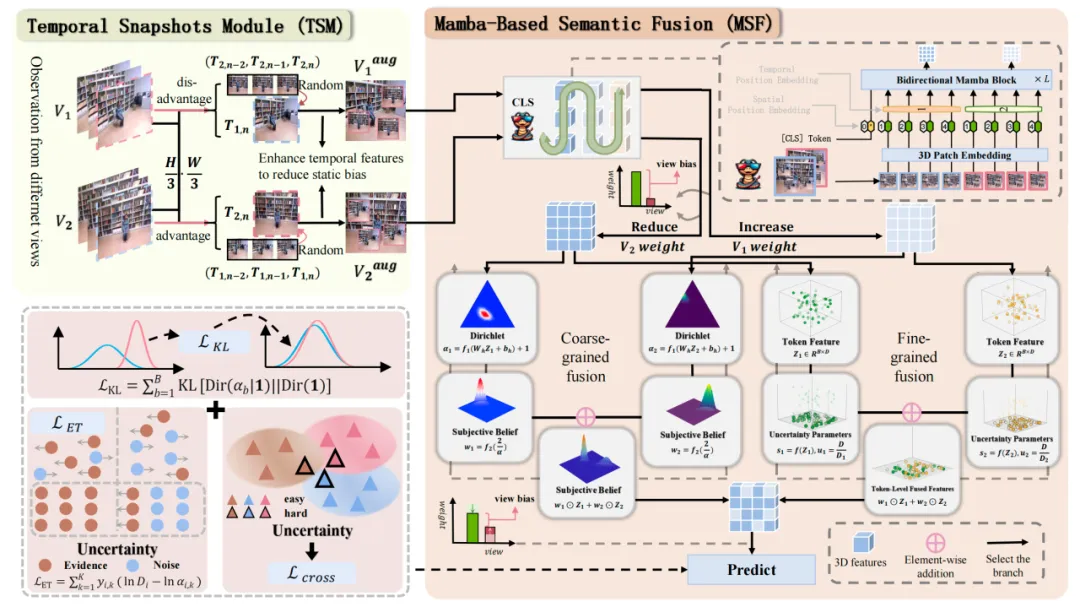 该论文由冯炜等同学在钟忺、刘文璇等老师的指导下开展研究。论文聚焦多视角动作识别这一典型而富有挑战性的视觉理解任务,围绕复杂场景中模型泛化能力不足的问题展开深入分析。研究发现,现有方法在学习过程中往往受到静态背景信息和视角不对称因素的影响,从而产生隐性偏差,限制了模型在遮挡严重或动作复杂场景下的表现。