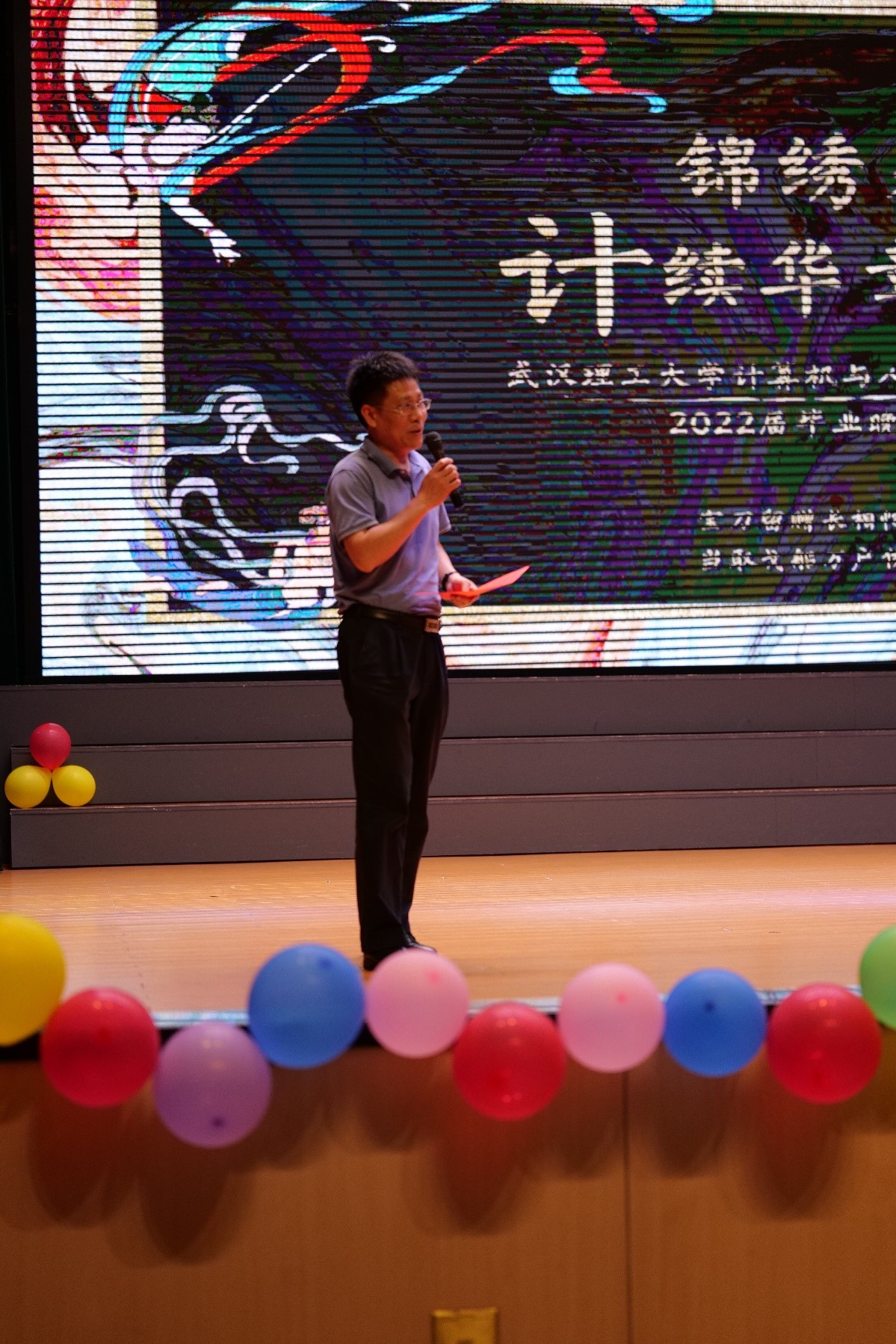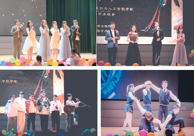 随后,毕业晚会在开场倒计时视频中热烈展开,毕业班每个人都至少出现一次的视频勾起了同学们的点滴回忆,以《巴啦啦小魔仙》、《猪猪侠》和《奔跑的青春》串烧组成的开场舞把同学们带入了青春的往昔、点燃了现场的激情。紧接着,晚会进入第一篇章:“素时锦年”。《知更鸟》乐队的完美演奏展现了青春的激昂,原唱说唱曲目《余家头的四年》讲述了演唱者余沐钒同学自己的大学故事,也引起了同学们的阵阵共鸣。舞蹈《Tomboy》、《寄明月》和《夜泊秦淮》以不同的舞蹈风格展现了不一样的魅力,给观众带来了不同的视觉盛宴。最后来自研究生辅导员李珏、戴美娟、郭文锋和乔思阳老师们的一首《武理版成都》让现场的同学们齐声说出“武理,我深爱你到白头”!